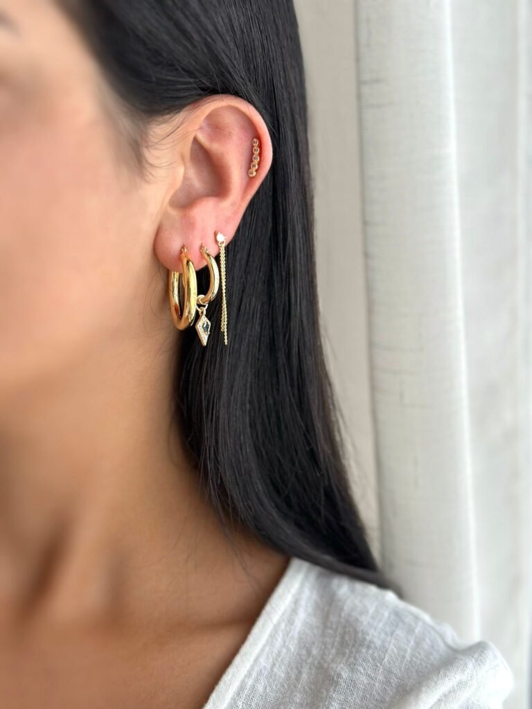 סט פליז ציפוי זהב 4 עגילים מורכב משני עגילי חישוק, עגיל תלוי ועוד עגיל צמוד אחת ניתן לשלב אותם איך שאוהבים על האוזן